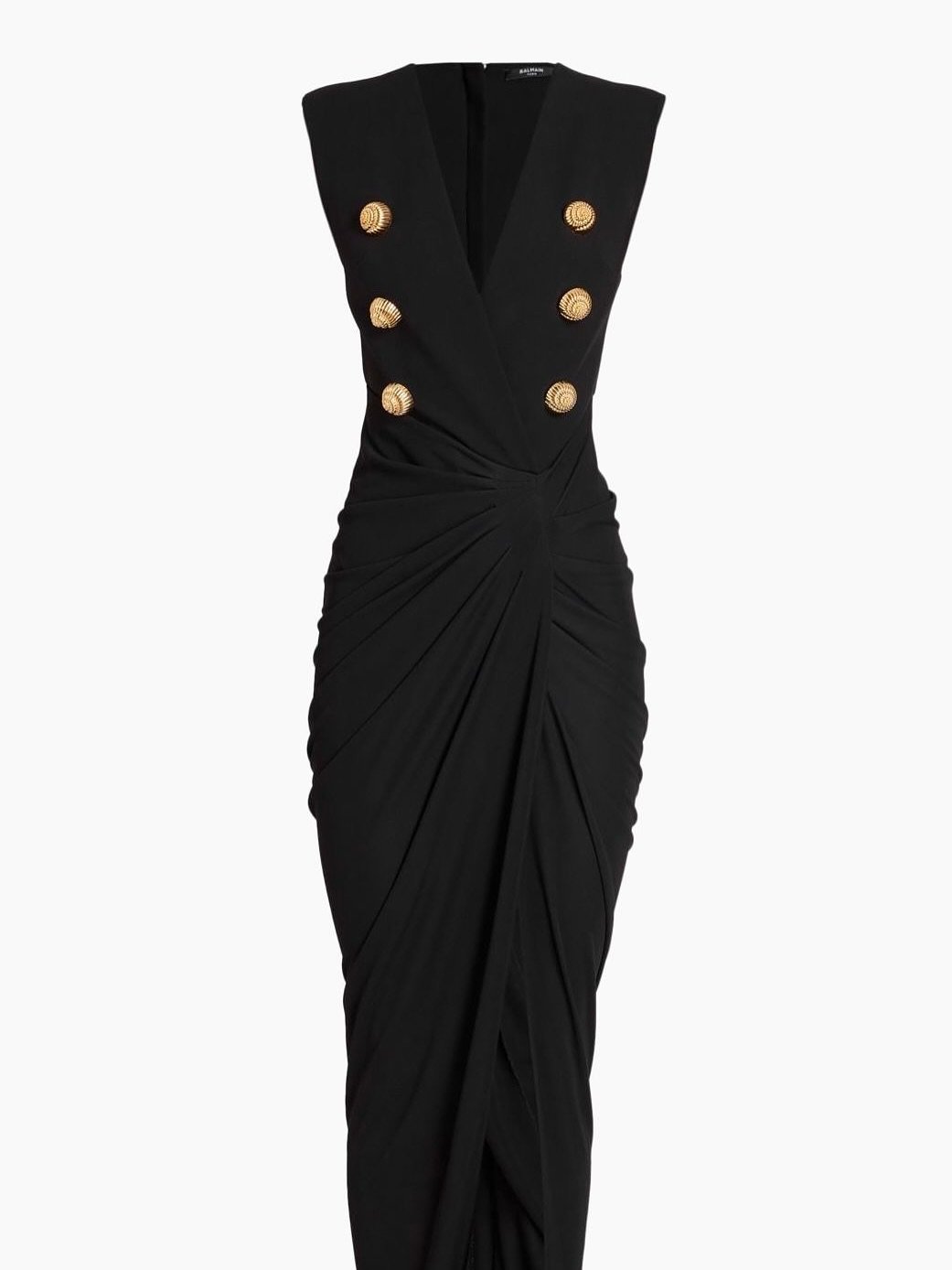 Vestido negro de corte midi con detalle de botones dorados y drapeado frontal. Un diseño elegante y sofisticado que estiliza la silueta y realza tu presencia en cualquier evento nocturno.